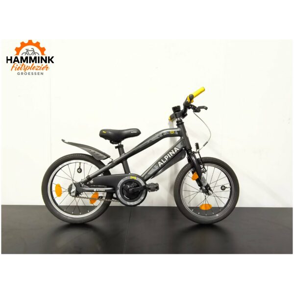 Tweedehands Alpina Trial 16 inch jongensfiets. Uitgerust met een handrem en een terugtraprem, aluminium frame met een hoogte van 26 cm. Je ontvangt 8 dagen omruilgarantie op deze fiets.
