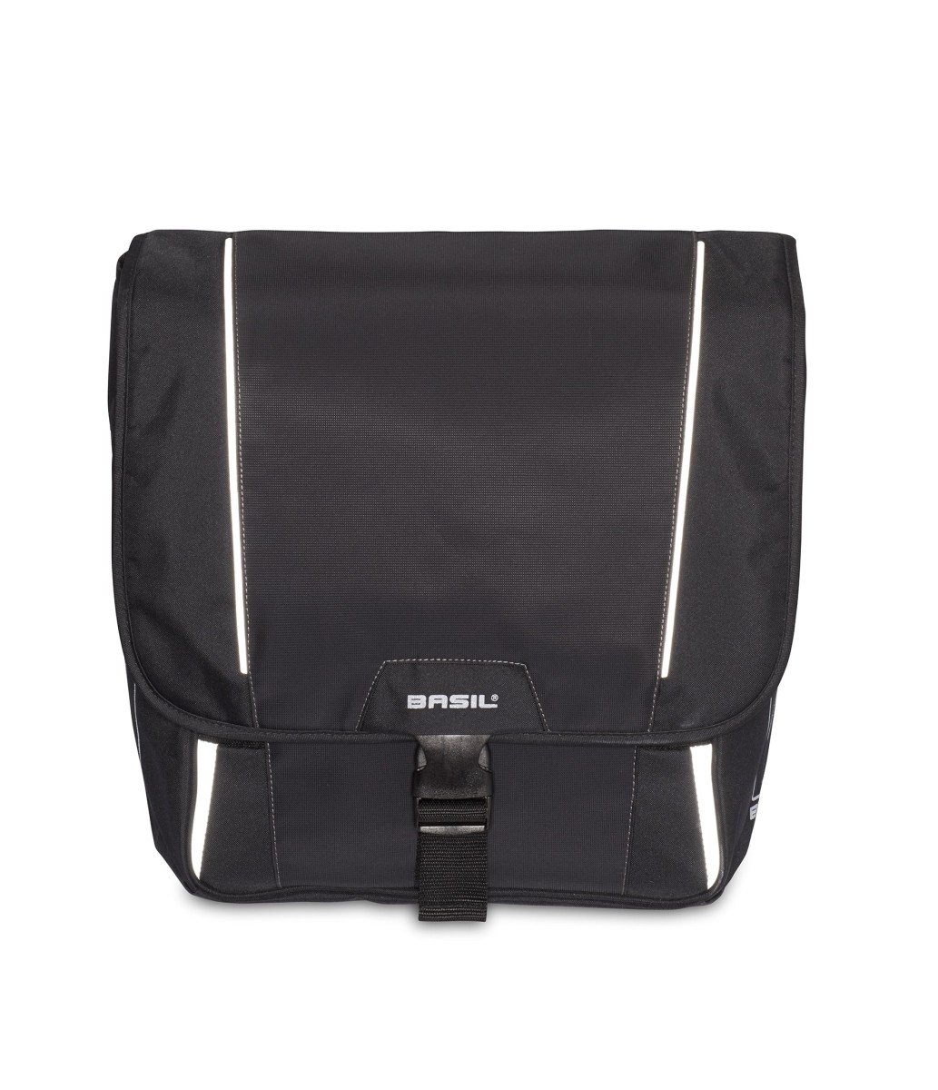 Basil Sport Design-Double Bag. Dubbele fietstas, gemaakt van hoogwaardig materiaal, hoofdcompartiment met aansnoerkoord, Universal Bridge system (o.a. voor MIK, Racktime, i-Rack/Carrymore platen (niet inbegrepen)), t.b.v. LED/snelbinders/kinderzitje/veerklem, veilige reflectie, inhoud: 32L, Zwart.