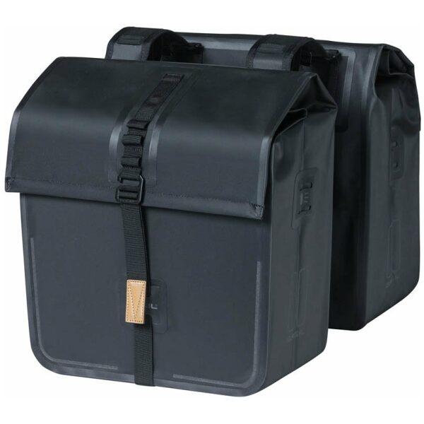 Basil Urban Dry Double Bag. Dubbele fietstas, waterdicht (IPX 3), gemaakt van tarpaulin, gelaste naden, vouwsluiting, bevestigingsmogelijkheid LED, vegan leather details, verstelbare sluiting, Universal Bridge system (o.a. voor Racktime, i-Rack/Carrymore platen), reflectie, inhoud: 50L, Solid Black.