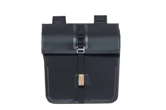 Basil Urban Dry Double Bag. Dubbele fietstas, waterdicht (IPX 3), gemaakt van tarpaulin, gelaste naden, vouwsluiting, bevestigingsmogelijkheid LED, vegan leather details, verstelbare sluiting, Universal Bridge system (o.a. voor Racktime, i-Rack/Carrymore platen), reflectie, inhoud: 50L, Solid Black.