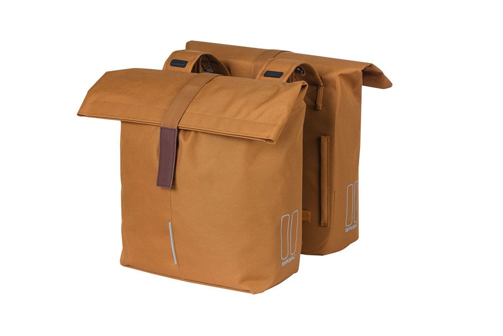 Basil City dubbele fietstas, waterafstotend polyester, waterkerende vouwsluiting, extra banden met klittenbandsluiting, Universal Bridge systeem (geschikt voor Basil DBS, MIK, Racktime platen (apart verkrijgbaar)), reflectie op alle zijden, 28-32L, camel bruin