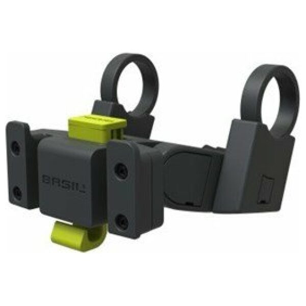 Basil Handlebar Holder for klickfix plates. Stuurbochthouder, gemaakt van kunststof, snelle montage, geschikt voor stuurbochten van 22 – 31,8mm, instelbare hoek, zeer stabiel i.v.m. extra borging, voor alle Klickfix platen, Dankzij die meegeleverde verbredingselementen, monteer je de houder ook op stuurbochten waar een display op zit.o.a. BOSCH-system, afstand tussen de bevestiging is dan 90mm
