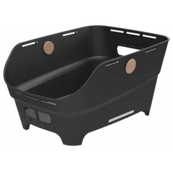 Achtermand, WSL-systeem, past op dragers met verhoogde voor-/achterkant, geschikt voor E-bikes met accu in drager, 46×35×25 cm, 1,5 kg, gerecycled kunststof, afgeschuind, in lengterichting op bagagedrager, afneembare bagageband, reflectie, zwart.