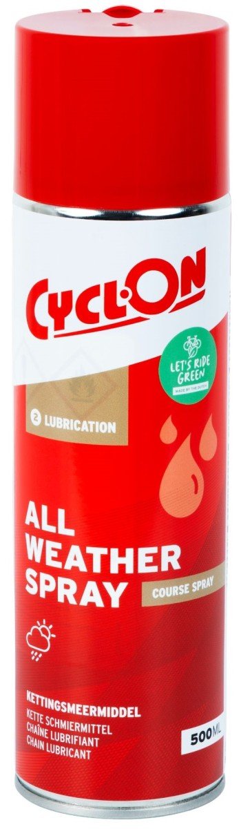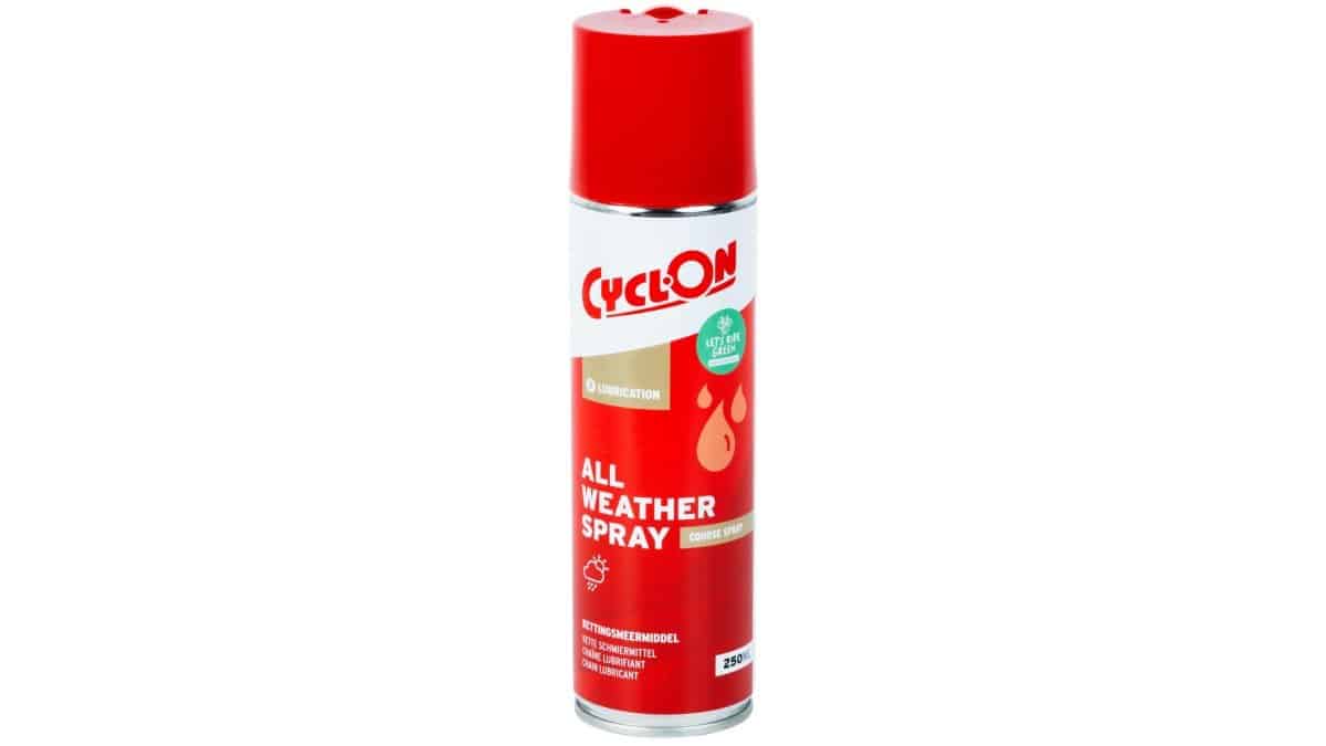 All Weather Spray! Lagere wrijvingsweerstand, betere bescherming, minder vaak smeren en duurzaam! Gebruik CyclOn All Weather Spray om je ketting te smeren. Dit duurzame smeermiddel heeft een lage wrijvingsweerstand en kun je gebruiken tijdens alle weersomstandigheden. Het zorgt voor een soepel lopende aandrijflijn en langdurige smering van je ketting.