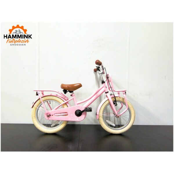 Een roze Popal Cooper 16 inch kinderfiets met terugtraprem. Deze fiets heeft 8 dagen omruilgarantie.