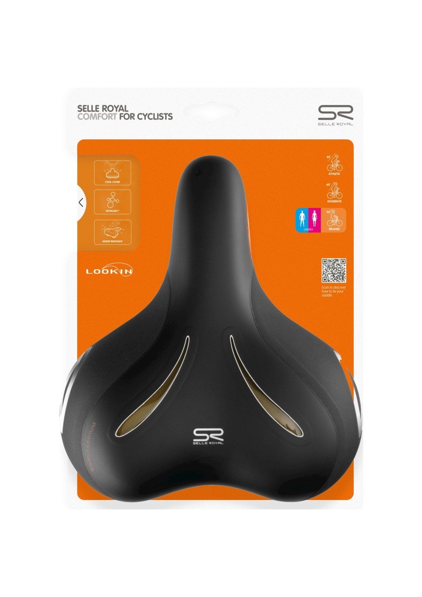 Lookin Relaxed unisex is uitgerust met een comfortabele vulling en centrale vensters die de Royalgel™ technologie aan de binnenkant zichtbaar maken. De zilveren flankbeschermingen beschermen tegen krassen en beschadigingen en ronden het unieke design af. Dankzij zijn unieke, driedimensionale gelstructuur staat Royalgel™ garant voor het hoogste comfort. Het vermindert de drukpieken namelijk tot maar liefst 40%. De bijzondere bekleding is 25°C koeler dan normale zwarte zadels dankzij speciaal materiaal dat het zonlicht reflecteert. Royal Vacuum Light is een gepatenteerde Selle Royal technologie die ervoor zorgt dat het zadel 100% gesealed is en dus waterdicht is. Zadels gemaakt middels deze productiemethode zijn bovendien 20% lichter dan gewone zadels in dezelfde categorie. Het gepatenteerde clip systeem aan de achterkant van het zadel maakt het heel gemakkelijk om een Selle Royal zadeltasje of ander accessoire aan te brengen.