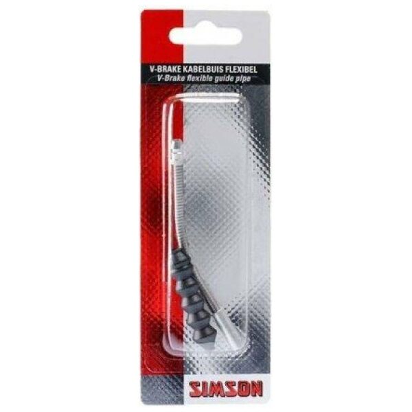 De Simson Remkabelbuis V-Brake met een flexibele bocht voor een goede aansluiting tussen de remkabel en het V-brake remsysteem. Hierdoor wordt de remkracht correct overgebracht op het V-Brake remsysteem. Sluit de buitenkabel aan op de remkabelbuis. Trek de binnenkabel van de rem door de remkabelbuis en sluit de binnenkabel aan op het V-brake remsysteem met een inbussleutel. De Simson remkabelbuis wordt geleverd inclusief stofrubber.