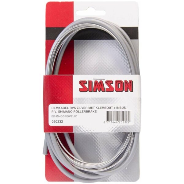 Deze Simson Remkabelset met grijze buitenkabel is een complete remkabelset geschikt voor Shimano Rollerbrake remmen BR-IM45/55/80/81/85. De binnenkabel van 2,25 meter met tonnippel is gemaakt van roestvrijstaal zodat de kabel minder snel rekt. Door zijn lengte is de kabel geschikt voor zowel voor- als achter rollerbrake rem. De set is inclusief inbussleutel en bevestigingsmateriaal. Steek de binnenkabel door de buitenkabel en sluit de binnenkabel aan op de rem. Stel de rem af en knip de binnenkabel A± 2 cm voorbij schroefnippel af.
