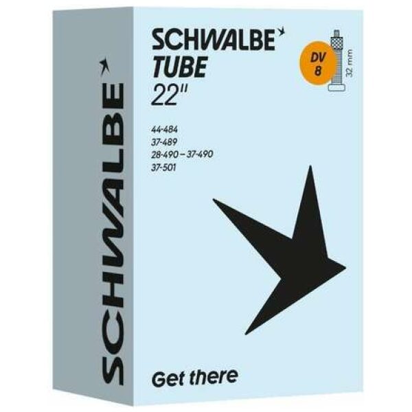 Schwalbe binnenband DV8 geschikt voor 22 inch, in de ETRTO maat 28/44-484/501. Voorzien van een 32mm lang Hollands/Dunlop ventiel. Schwalbe binnenbanden zijn 100% volledig recyclebaar.