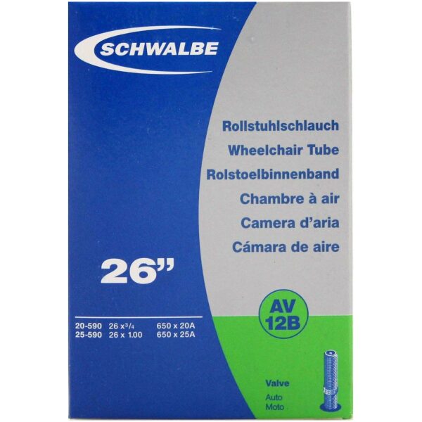 Schwalbe binnenband Smal 26 Inch Auto (Rolstoel) – AV12B/25-584, 28-584, 20-590, 25-590. De Schwalbe binnenbanden zijn betrouwbaar. Fietsdetaillisten waarderen hem om zijn hoge betrouwbaarheid. Iedere band wordt in de fabriek opgepompt en zo 24 uur op luchtdichtheid getest. De band houdt de luchtdruk langer vast. In de productie vereist Schwalbe een zeer hoog butyl aandeel en een zeer hoge reinheid van het materiaal. Zo houdt de Schwalbe binnenband de luchtdruk beduidend langer vast dan andere binnenbanden. Het is een groepen-binnenbandsysteem: Een Schwalbe binnenband is extreem elastisch en past op meerdere bandafmetingen. Hierdoor worden ze groepen binnenbanden genoemd. Zo past bijvoorbeeld de binnenband met nummer 19A voor bandafmeting van 27.5 inch tot 29 Inch en voor de breedte van 40 tot 62mm. Als laatste is de band 100% volledig recyclebaar. Speciaal voor de rolstoel.