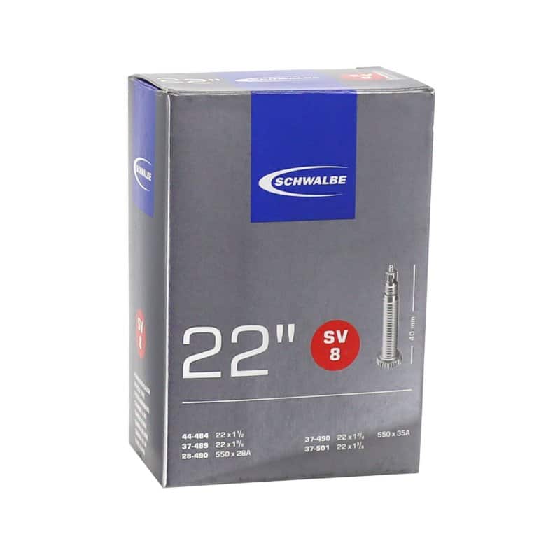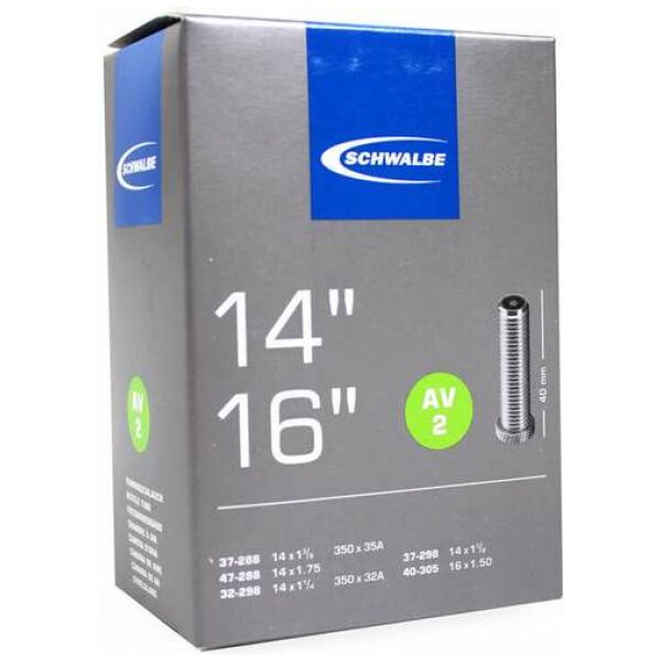 Schwalbe binnenband Smal 14 Inch Auto – AV2/37-288, 47-288, 32-298, 37-298, 40-305. De Schwalbe binnenbanden zijn betrouwbaar. Fietsdetaillisten waarderen hem om zijn hoge betrouwbaarheid. Iedere band wordt in de fabriek opgepompt en zo 24 uur op luchtdichtheid getest. De band houdt de luchtdruk langer vast. In de productie vereist Schwalbe een zeer hoog butyl aandeel en een zeer hoge reinheid van het materiaal. Zo houdt de Schwalbe binnenband de luchtdruk beduidend langer vast dan andere binnenbanden. Het is een groepen-binnenbandsysteem: Een Schwalbe binnenband is extreem elastisch en past op meerdere bandafmetingen. Hierdoor worden ze groepen binnenbanden genoemd. Zo past bijvoorbeeld de binnenband met nummer 19A voor bandafmeting van 27.5 inch tot 29 Inch en voor de breedte van 40 tot 62mm. Als laatste is de band 100% volledig recyclebaar. Standaarduitvoering: Hoge betrouwbaarheid, al vele jaren beproefd.