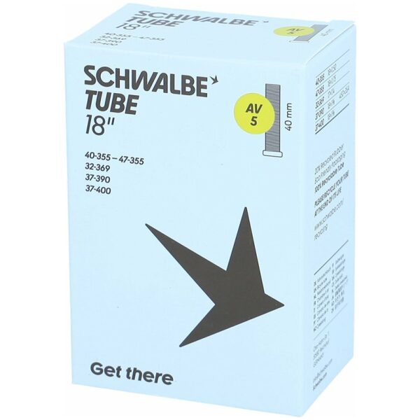 Schwalbe binnenband AV5, geschikt voor 18 inch, in de ETRTO maat 32/47-355/400. Voorzien van een 40mm lang Auto/Schrader ventiel. Schwalbe binnenbanden zijn 100% volledig recyclebaar.