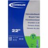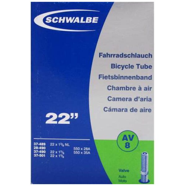 Schwalbe binnenband Standaard 22 Inch Auto – AV8/44-484, 37-489, 28-490, 37-490, 37-501. De Schwalbe binnenbanden zijn betrouwbaar. Fietsdetaillisten waarderen hem om zijn hoge betrouwbaarheid. Iedere band wordt in de fabriek opgepompt en zo 24 uur op luchtdichtheid getest. De band houdt de luchtdruk langer vast. In de productie vereist Schwalbe een zeer hoog butyl aandeel en een zeer hoge reinheid van het materiaal. Zo houdt de Schwalbe binnenband de luchtdruk beduidend langer vast dan andere binnenbanden. Het is een groepen-binnenbandsysteem: Een Schwalbe binnenband is extreem elastisch en past op meerdere bandafmetingen. Hierdoor worden ze groepen binnenbanden genoemd. Zo past bijvoorbeeld de binnenband met nummer 19A voor bandafmeting van 27.5 inch tot 29 Inch en voor de breedte van 40 tot 62mm. Als laatste is de band 100% volledig recyclebaar. Standaarduitvoering: Hoge betrouwbaarheid, al vele jaren beproefd.