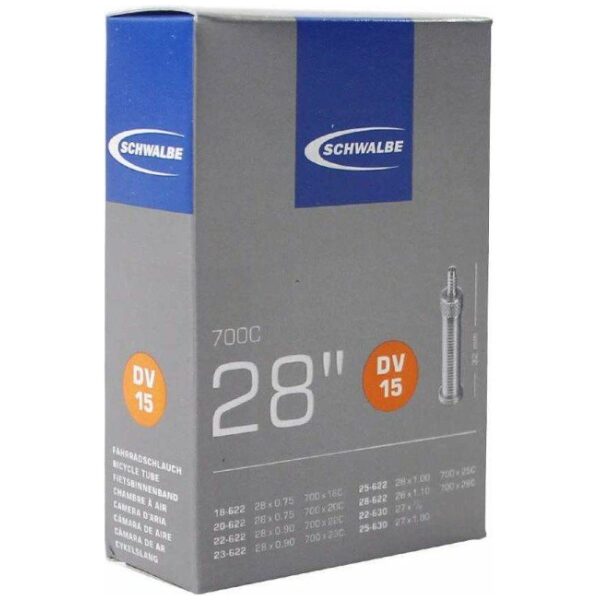 Schwalbe binnenband Smal Road 26 Inch Hollands – DV15/18-622, 20-622, 22-622, 23-622, 25-622, 28-622*, 22-630, 25-630. De Schwalbe binnenbanden zijn betrouwbaar. Fietsdetaillisten waarderen hem om zijn hoge betrouwbaarheid. Iedere band wordt in de fabriek opgepompt en zo 24 uur op luchtdichtheid getest. De band houdt de luchtdruk langer vast. In de productie vereist Schwalbe een zeer hoog butyl aandeel en een zeer hoge reinheid van het materiaal. Zo houdt de Schwalbe binnenband de luchtdruk beduidend langer vast dan andere binnenbanden. Het is een groepen-binnenbandsysteem: Een Schwalbe binnenband is extreem elastisch en past op meerdere bandafmetingen. Hierdoor worden ze groepen binnenbanden genoemd. Zo past bijvoorbeeld de binnenband met nummer 19A voor bandafmeting van 27.5 inch tot 29 Inch en voor de breedte van 40 tot 62mm. Als laatste is de band 100% volledig recyclebaar. Standaarduitvoering: Hoge betrouwbaarheid, al vele jaren beproefd. *Niet in de Extralight-uitvoering verkrijgbaar.