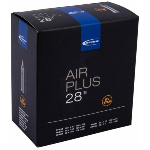 Schwalbe binnenband Air Plus 28 inch 37/47-622/635 Dunlop ventiel, houdt langer de lucht vast, Door het hoge zuivere butylaandeel houdt de Schwalbe Air Plus binnenband de lucht beduidend langer vast. Hierdoor hoeft minder vaak bijgepompt te worden. hogere lekbescherming Dankzij de dikkere wandsterkte is de Schwalbe Air Plus bijzonder robuust en daardoor zeer goed beschermd tegen lekrijden. Wanneer de Schwalbe Air Plus alsnog vervangen moet worden is deze evenals alle andere Schwalbe binnenbanden 100% recyclebaar. Ideaal voor E-Bike en Cargo bikes.