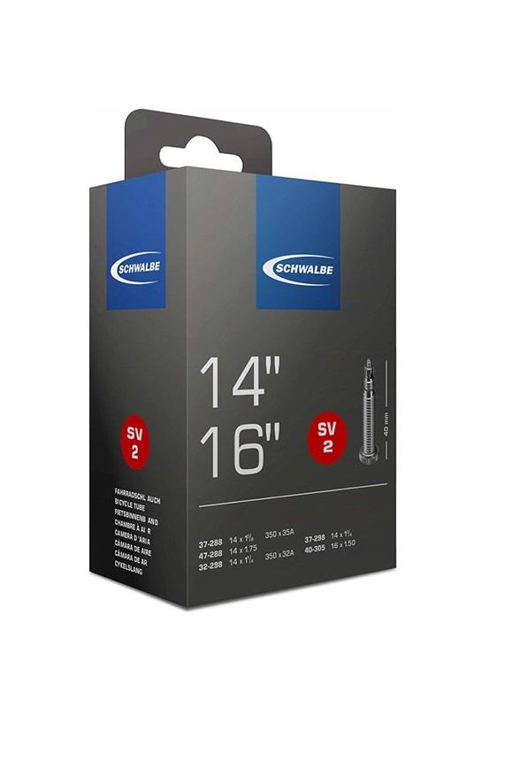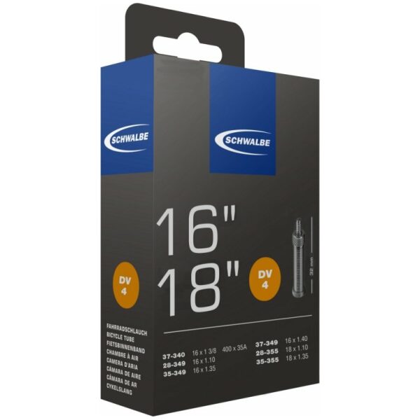 Schwalbe binnenband Standaard 16×1 3/8 Hollands – DV4/37-340, 28-349, 35-349, 37-349, 28-355, 35-355. De Schwalbe binnenbanden zijn betrouwbaar. Fietsdetaillisten waarderen hem om zijn hoge betrouwbaarheid. Iedere band wordt in de fabriek opgepompt en zo 24 uur op luchtdichtheid getest. De band houdt de luchtdruk langer vast. In de productie vereist Schwalbe een zeer hoog butyl aandeel en een zeer hoge reinheid van het materiaal. Zo houdt de Schwalbe binnenband de luchtdruk beduidend langer vast dan andere binnenbanden. Het is een groepen-binnenbandsysteem: Een Schwalbe binnenband is extreem elastisch en past op meerdere bandafmetingen. Hierdoor worden ze groepen binnenbanden genoemd. Zo past bijvoorbeeld de binnenband met nummer 19A voor bandafmeting van 27.5 inch tot 29 Inch en voor de breedte van 40 tot 62mm. Als laatste is de band 100% volledig recyclebaar. Standaarduitvoering: Hoge betrouwbaarheid, al vele jaren beproefd.