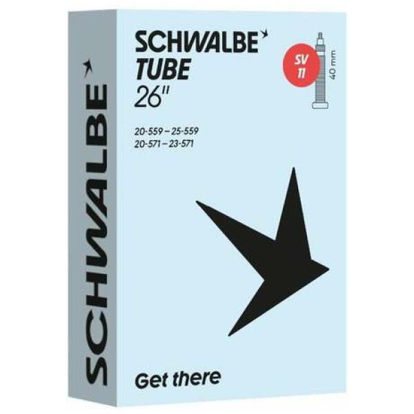 Schwalbe binnenband SV11, geschikt voor 26 inch, in de ETRTO maat 20/25-559/571. Voorzien van een 40mm lang Frans/Sclaverand ventiel. Schwalbe binnenbanden zijn 100% volledig recyclebaar.