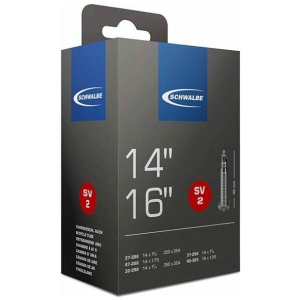 Schwalbe binnenband Standaard 14 Inch Frans – SV2/37-288, 47-588, 32-298, 37-298, 40-305. De Schwalbe binnenbanden zijn betrouwbaar. Fietsdetaillisten waarderen hem om zijn hoge betrouwbaarheid. Iedere band wordt in de fabriek opgepompt en zo 24 uur op luchtdichtheid getest. De band houdt de luchtdruk langer vast. In de productie vereist Schwalbe een zeer hoog butyl aandeel en een zeer hoge reinheid van het materiaal. Zo houdt de Schwalbe binnenband de luchtdruk beduidend langer vast dan andere binnenbanden. Het is een groepen-binnenbandsysteem: Een Schwalbe binnenband is extreem elastisch en past op meerdere bandafmetingen. Hierdoor worden ze groepen binnenbanden genoemd. Zo past bijvoorbeeld de binnenband met nummer 19A voor bandafmeting van 27.5 inch tot 29 Inch en voor de breedte van 40 tot 62mm. Als laatste is de band 100% volledig recyclebaar. Standaarduitvoering: Hoge betrouwbaarheid, al vele jaren beproefd.