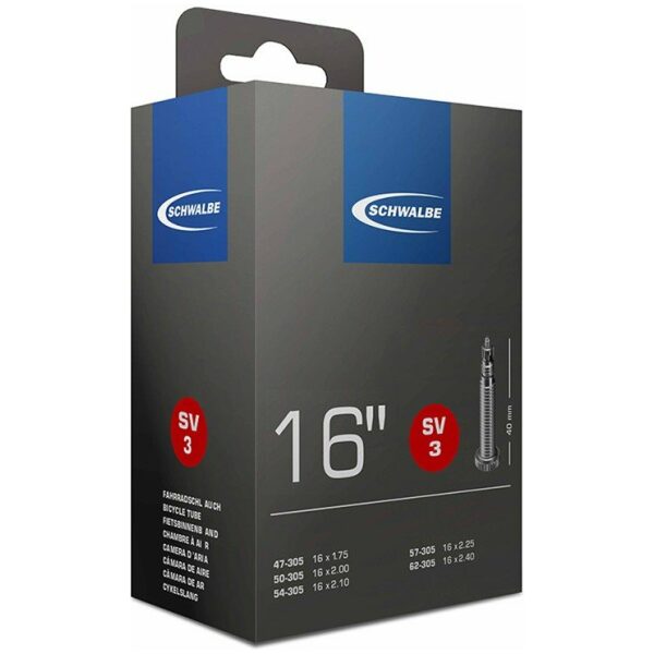 Schwalbe binnenband Standaard 16×1.75 Frans – SV3/47-305, 50-305, 54-305, 57-305, 62-305. De Schwalbe binnenbanden zijn betrouwbaar. Fietsdetaillisten waarderen hem om zijn hoge betrouwbaarheid. Iedere band wordt in de fabriek opgepompt en zo 24 uur op luchtdichtheid getest. De band houdt de luchtdruk langer vast. In de productie vereist Schwalbe een zeer hoog butyl aandeel en een zeer hoge reinheid van het materiaal. Zo houdt de Schwalbe binnenband de luchtdruk beduidend langer vast dan andere binnenbanden. Het is een groepen-binnenbandsysteem: Een Schwalbe binnenband is extreem elastisch en past op meerdere bandafmetingen. Hierdoor worden ze groepen binnenbanden genoemd. Zo past bijvoorbeeld de binnenband met nummer 19A voor bandafmeting van 27.5 inch tot 29 Inch en voor de breedte van 40 tot 62mm. Als laatste is de band 100% volledig recyclebaar. Standaarduitvoering: Hoge betrouwbaarheid, al vele jaren beproefd.