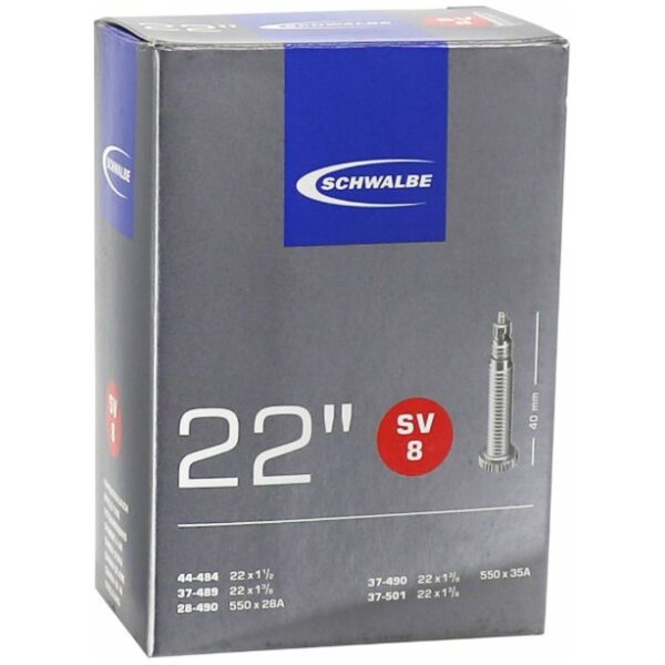 Schwalbe binnenband Standaard 22 Inch Frans – SV8/44-484, 37-489, 28-490, 37-490, 37-501. De Schwalbe binnenbanden zijn betrouwbaar. Fietsdetaillisten waarderen hem om zijn hoge betrouwbaarheid. Iedere band wordt in de fabriek opgepompt en zo 24 uur op luchtdichtheid getest. De band houdt de luchtdruk langer vast. In de productie vereist Schwalbe een zeer hoog butyl aandeel en een zeer hoge reinheid van het materiaal. Zo houdt de Schwalbe binnenband de luchtdruk beduidend langer vast dan andere binnenbanden. Het is een groepen-binnenbandsysteem: Een Schwalbe binnenband is extreem elastisch en past op meerdere bandafmetingen. Hierdoor worden ze groepen binnenbanden genoemd. Zo past bijvoorbeeld de binnenband met nummer 19A voor bandafmeting van 27.5 inch tot 29 Inch en voor de breedte van 40 tot 62mm. Als laatste is de band 100% volledig recyclebaar. Standaarduitvoering: Hoge betrouwbaarheid, al vele jaren beproefd.