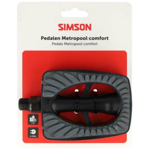 De Simson pedalen Metropool comfort zijn geschikt voor vrijwel iedere fiets, maar met name populair op stads-, tour-, oma en E-bike fietsen. De comfortabele pedalen zijn voorzien van reflectoren en zorgen met een kunststof “”””antislip”””” laag voor extra grip onder alle omstandigheden. De pedalen zijn te monteren met behulp van een Simson pedaalsleutel.