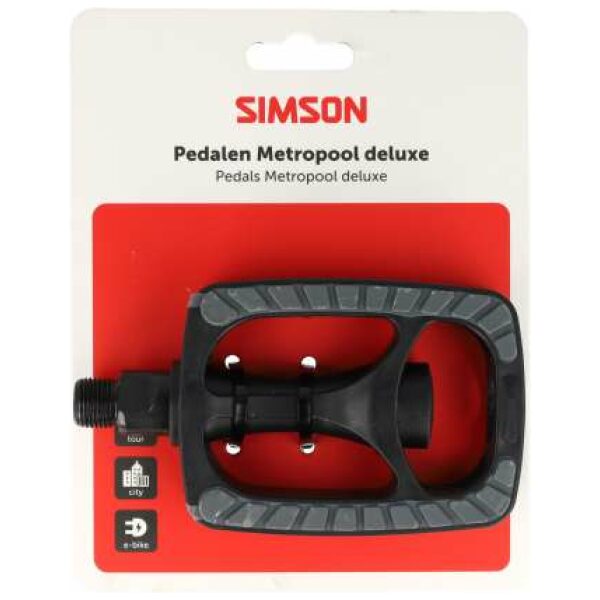 De Simson pedalen Metropool deLuxe zijn luxe fietspedalen, vervaardigd uit duurzaam materiaal. De pedalen zijn voorzien van reflectoren en aan beide kanten een grijze “”””antislip”””” laag voor extra grip in alle omstandigheden. De pedalen zijn geschikt voor vrijwel iedere fiets, maar is met name populair op stads-, trekking- en E-bike fietsen. De pedalen zijn te monteren met behulp van een Simson pedaalsleutel.
