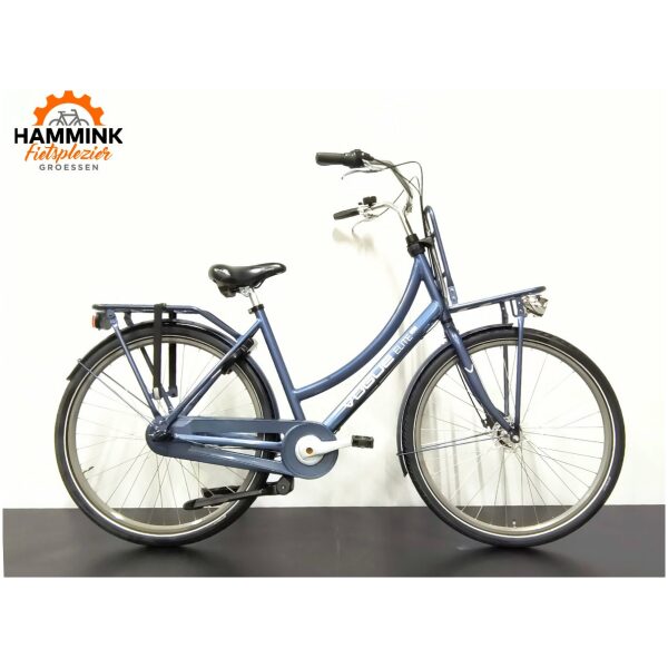 Een tweedehands donkerblauwe Vogue Elite Plus stadsfiets. Deze fiets heeft een framehoogte van 50 cm, 3 versnellingen, een stuurslot, dubbelstandaard en handremmen. Je ontvangt 3 maanden dealergarantie op deze Vogue.